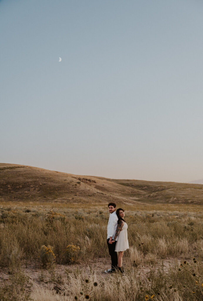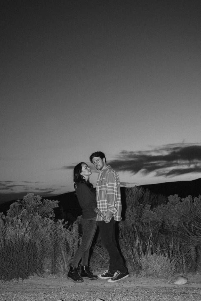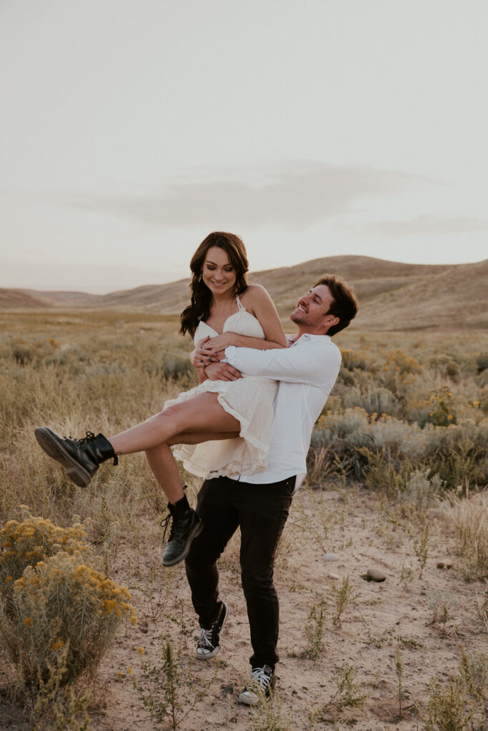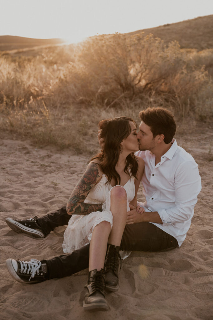 I first shot with Kaileigh and her daughter in the Sawtooth Mountains outside of Stanley, Idaho years ago when I first started photography. As time went on we became friends and I was SO excited to shoot with her + her boyfriend, Bryce. We chose the beautiful desert hills near Eagle, Idaho as a backdrop for their story. I love the Idaho desert because it’s neutral, warm, and sun filled – the taupes, sage, and golden light is some of my favorite to work with, and we shot into blue hour + dark for some fun flash vibes too!